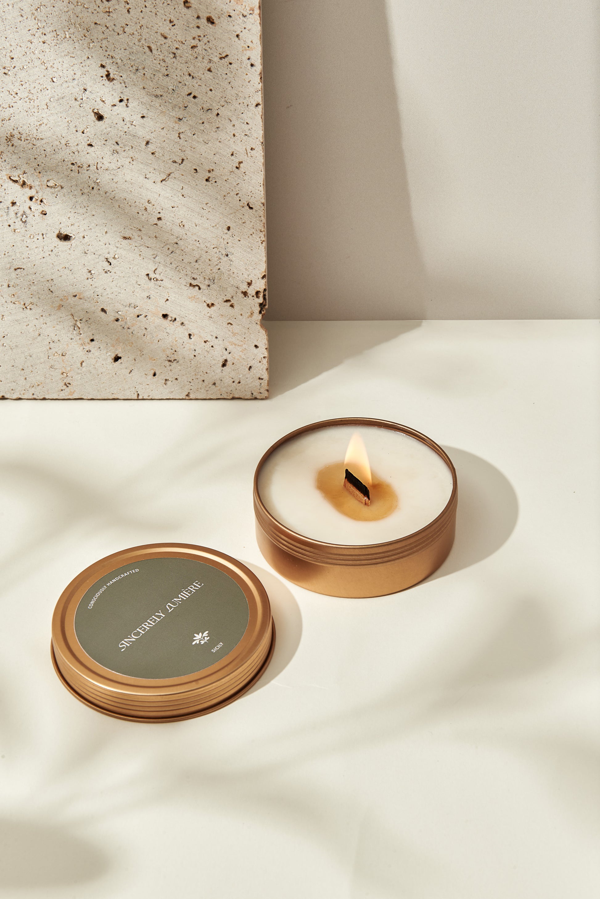 Notre magnifique bougie de luxe Sicile est également disponible dans cette magnifique boîte en métal doré brossé de 100 g. Parfait pour les petits espaces tels qu'une salle de bain, une cuisine, un petit salon et une chambre. Il est également parfait pour emporter avec vous le parfum réconfortant de votre maison lors de vos aventures.